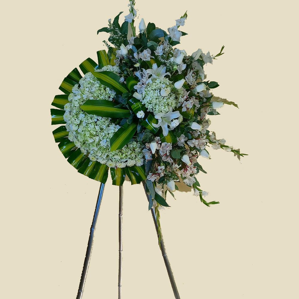 DESCRIPCIÓN: Corona blanca, 12 rosas blancas, 2 lilium, hortensias, gladiolos y follajes finos