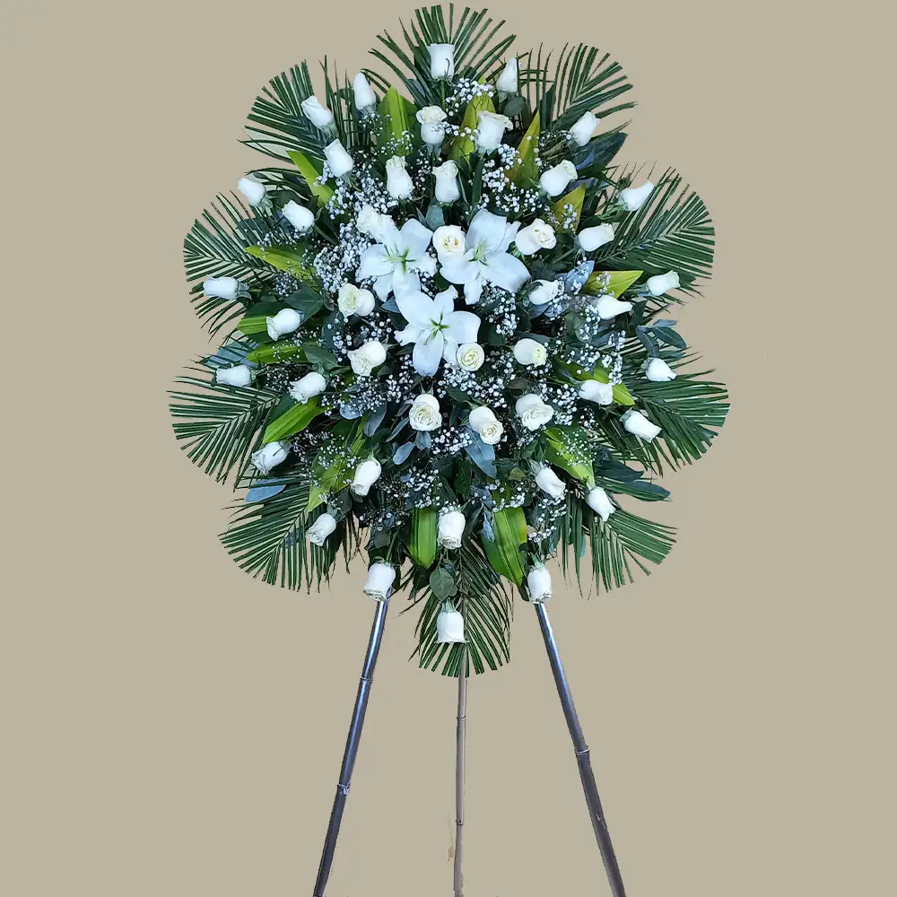 DESCRIPCIÓN: Trípode para Velorio, 48 rosas blancas más 5 lilium, gipso y follajes finos